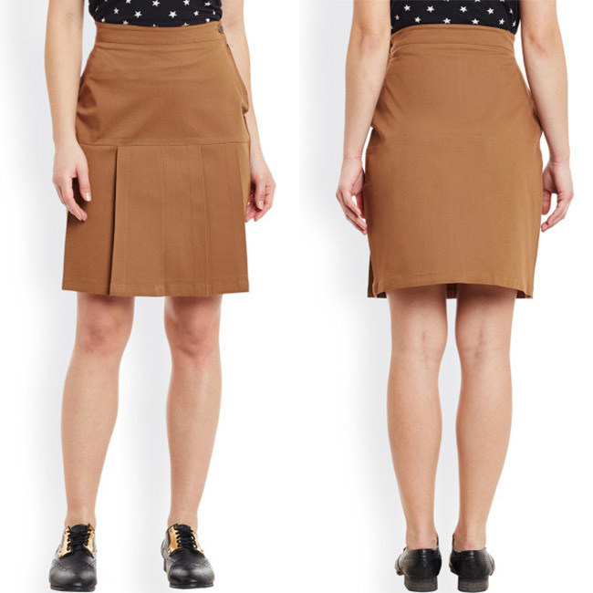Ontwerp: | Bruin geweven A-lijn rok, heeft een tailleband, een zip fly met knop sluiting aan de ene kant, gevouwen detail aan de voorzijde | |